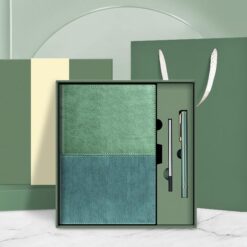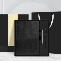 - Customizable Business Gift Set featuring a PU leather notebook, signature pen, and replacement pen refill.
